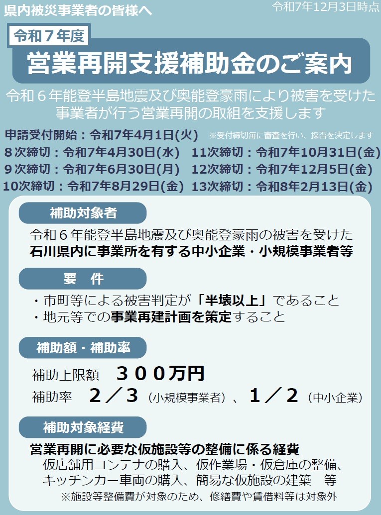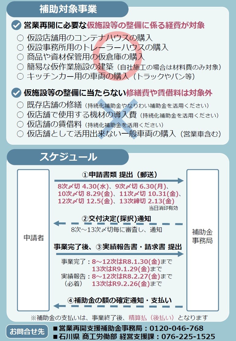 【営業再開支援補助金事務局】 フリーダイヤル:0120-046-768(土日祝日を除く10:00~17:00) 住 所:〒920-8203 |