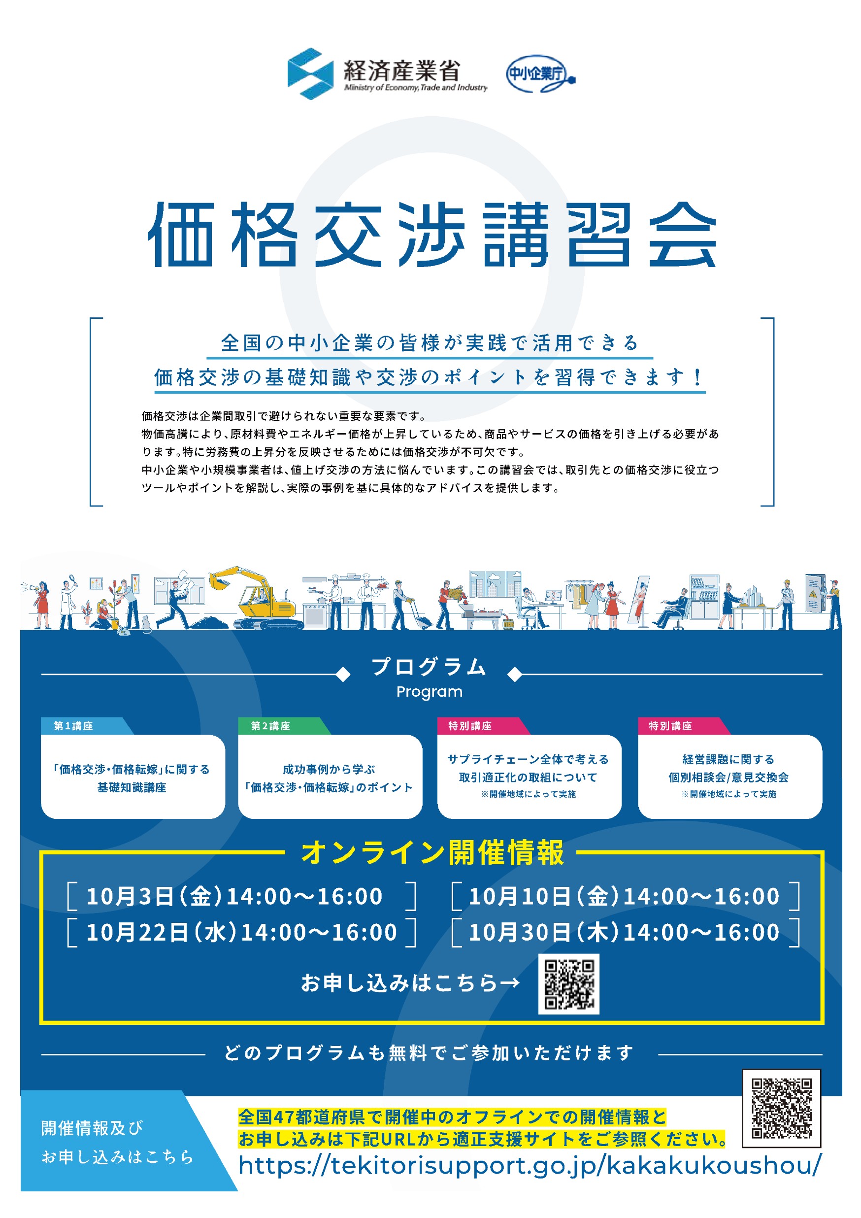 中小企業庁は、中小企業の皆様が取引先と価格交渉をする際に必要となる知識、ノウハウについて学べる講習会を全国47都道府県で開催しております。