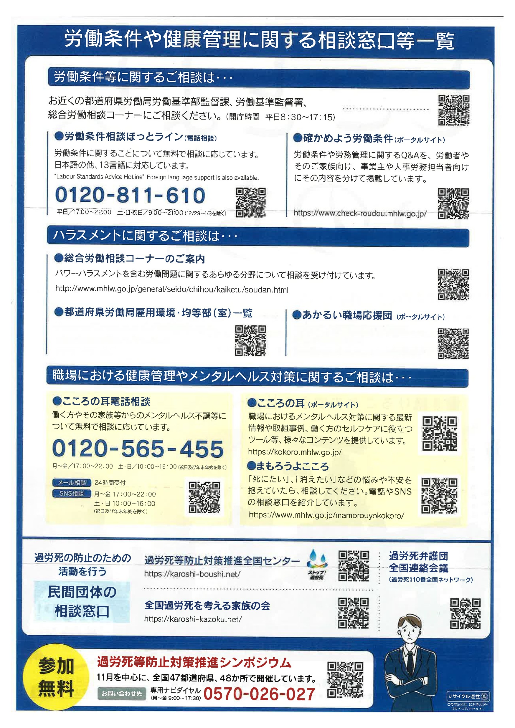 過労死等防止対策推進法では、国民の間に広く過労死等を防止することの重要性について自覚を促し、これに対する国民の関心と理解を深めるため、毎年11月を「過労死等防止啓発月間」と定めております。
